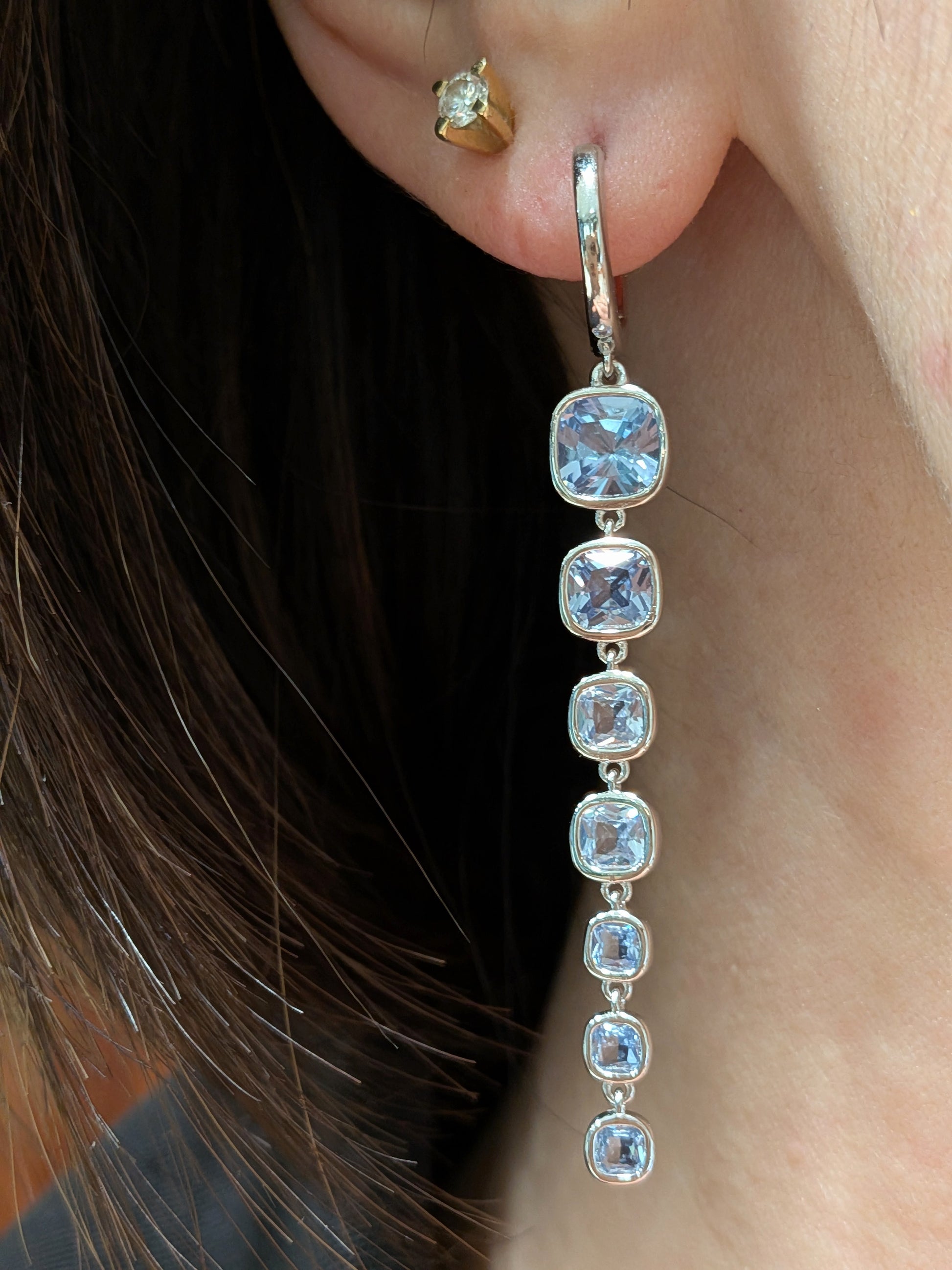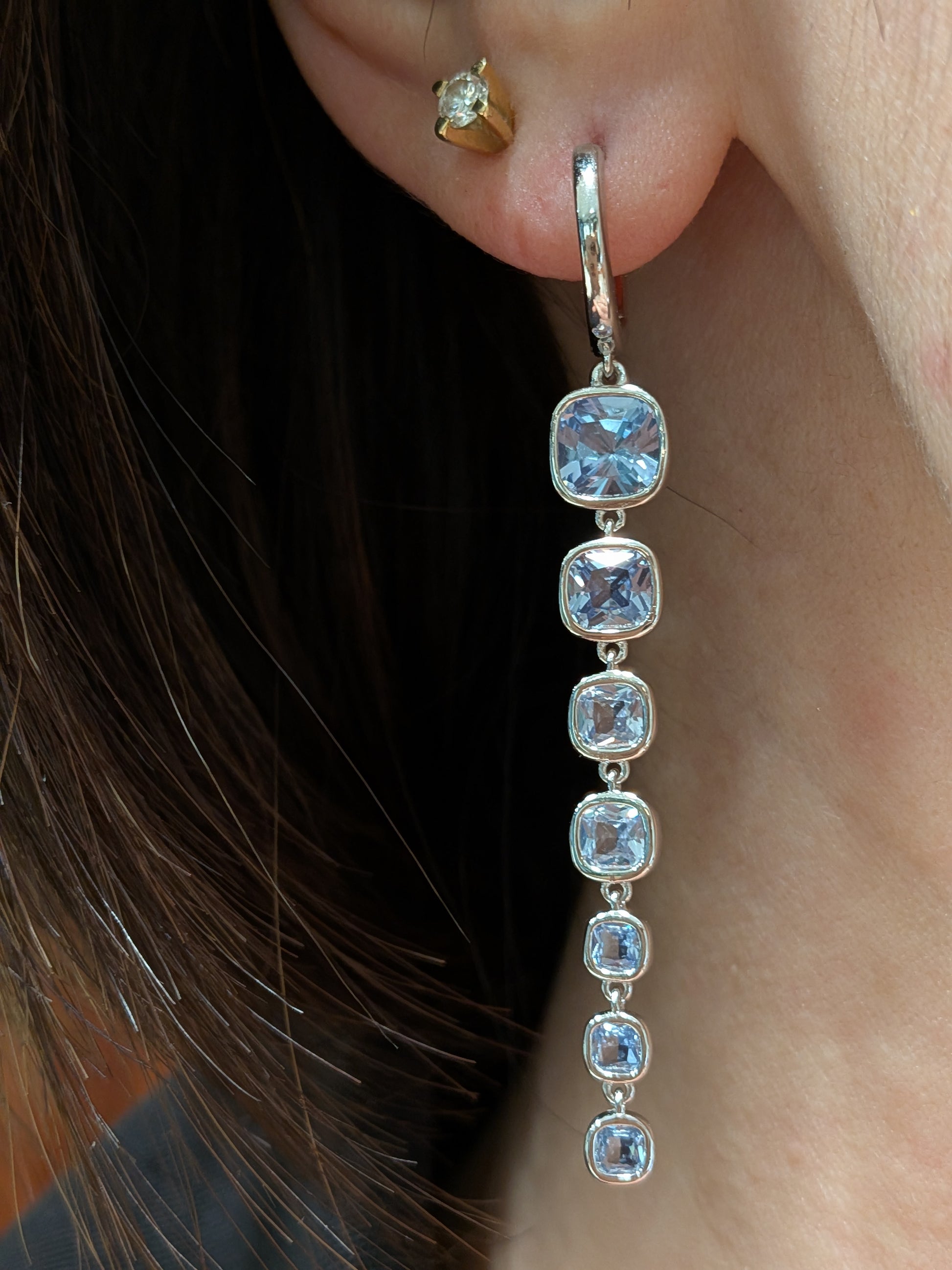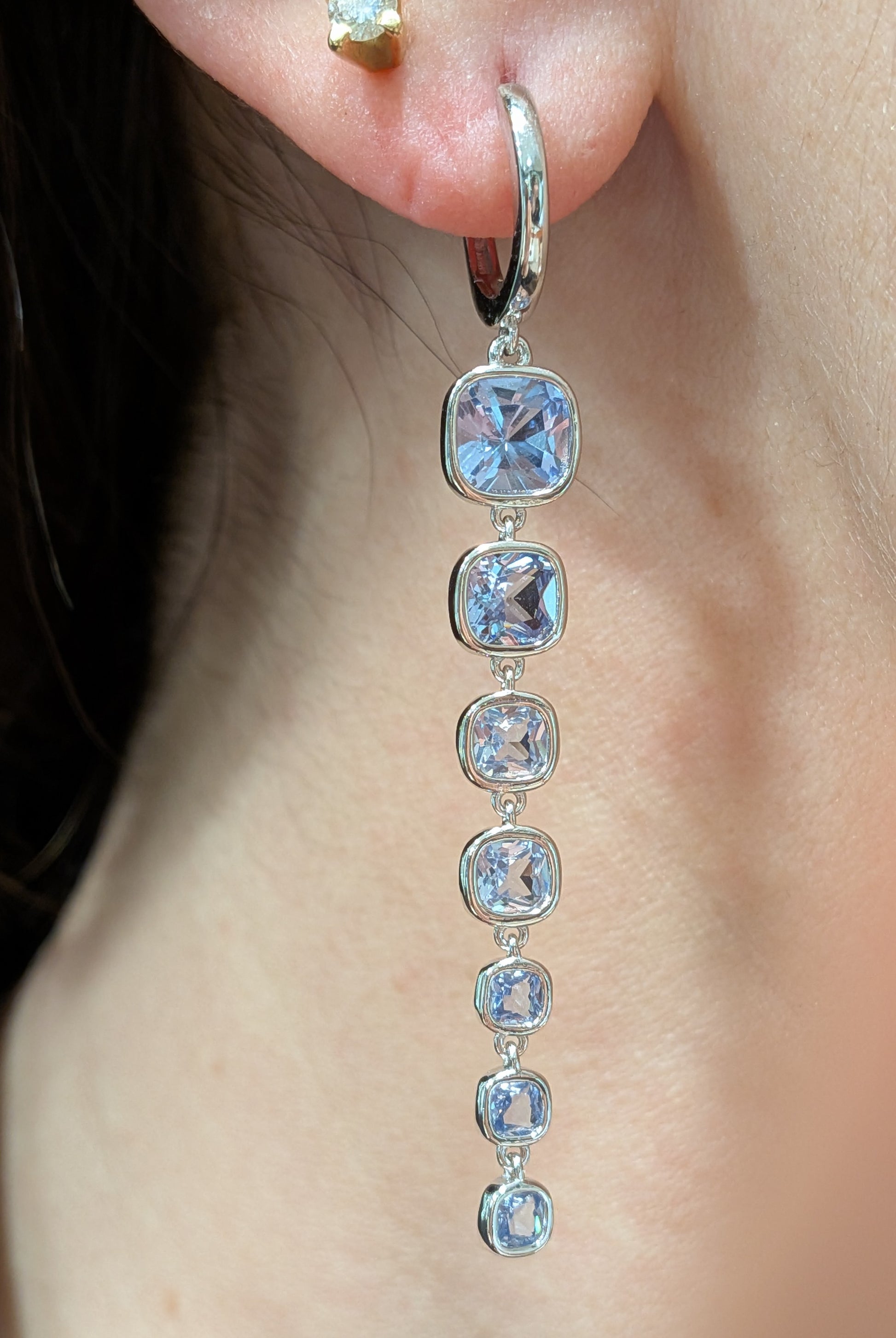 orecchini a cerchio liscio e lucido in argento rodiato 925 con chiusura a scatto. cascata di zirconia azzurro chiaro, taglio cuscino in gradazione, ognuno incastonato a notte. cm tot 5,5