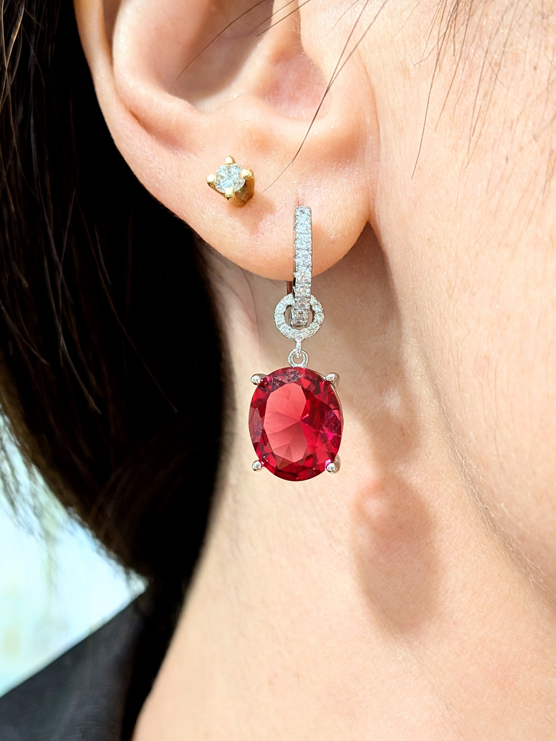 cerchietto in argento rodiato con piccole zirconia e un grande pendente ovale di un bel rosso/fucsia molto somigliante alla rubellite naturale. il bello di questo orecchino è che la parte sotto può essere tolta per sfruttare quotidianamente il cerchietto e messa per impreziosire il look