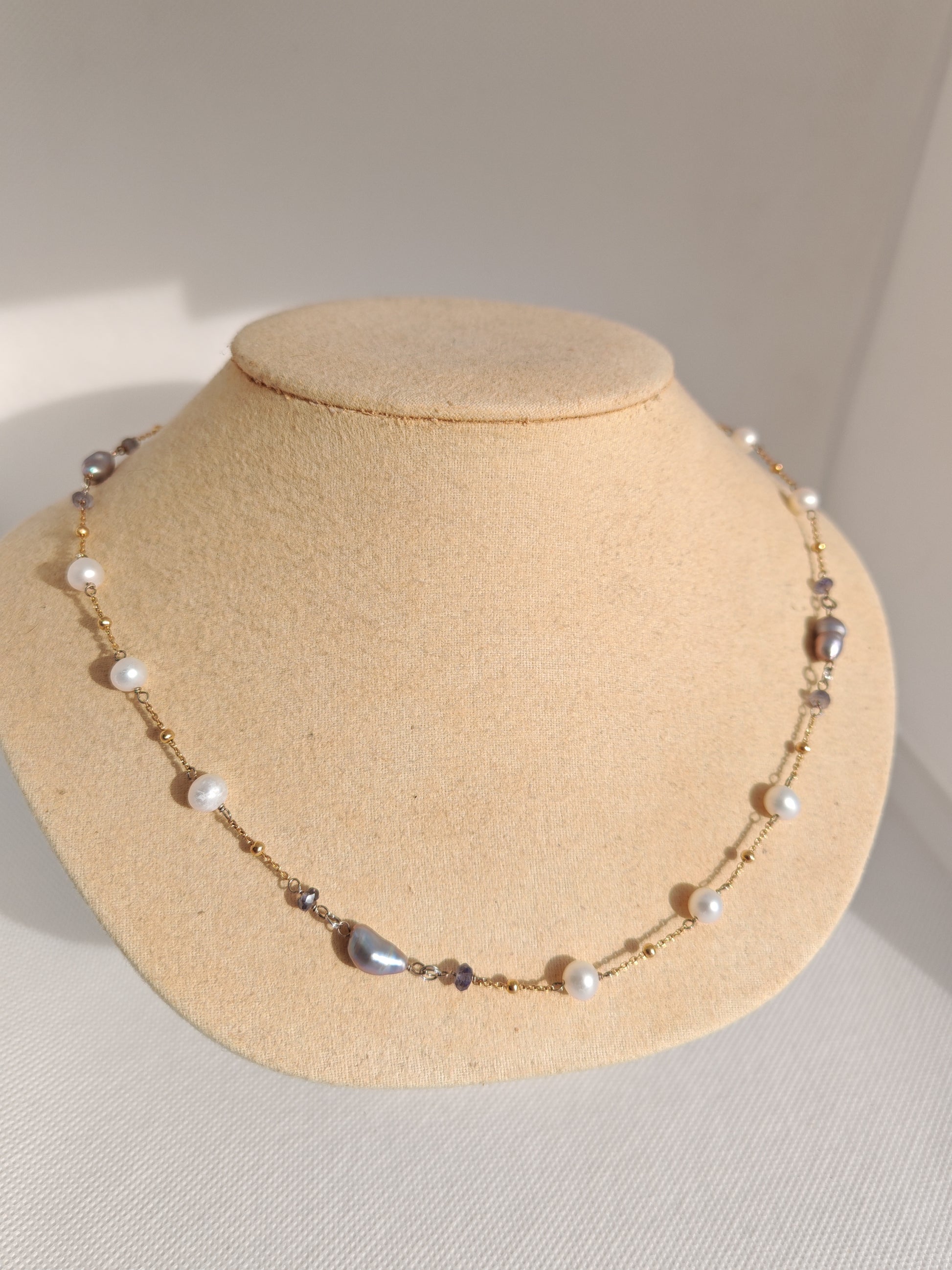 Questo girocollo è un pezzo unico in argento 925 ‰ , con un'elegante lavorazione "a rosario" che mette in risalto le perle naturali e le gemme di cianite. Un gioiello raffinato, perfetto per ogni occasione.