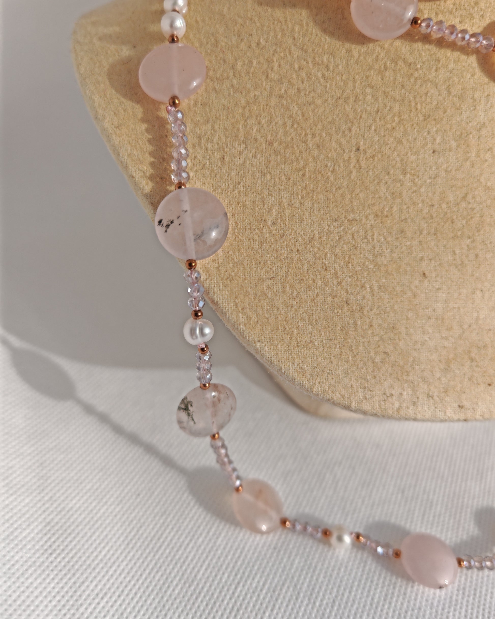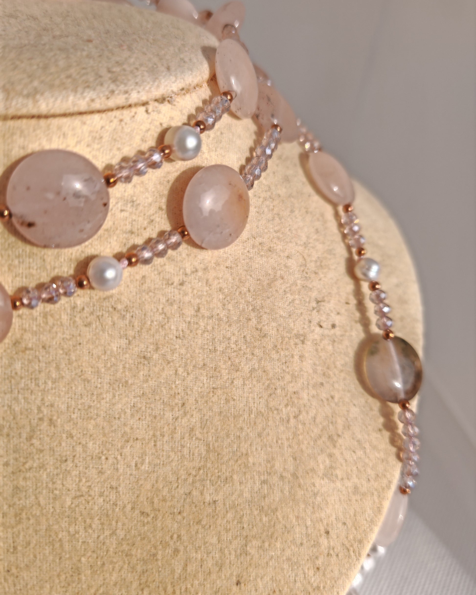 Inserti di Swarovski: L'intersezione di cristalli Swarovski aggiunge punti di luce scintillante, impreziosendo il gioiello e rendendolo più ricercato. La loro lucentezza esalta le tonalità delicate del quarzo e della madreperla.