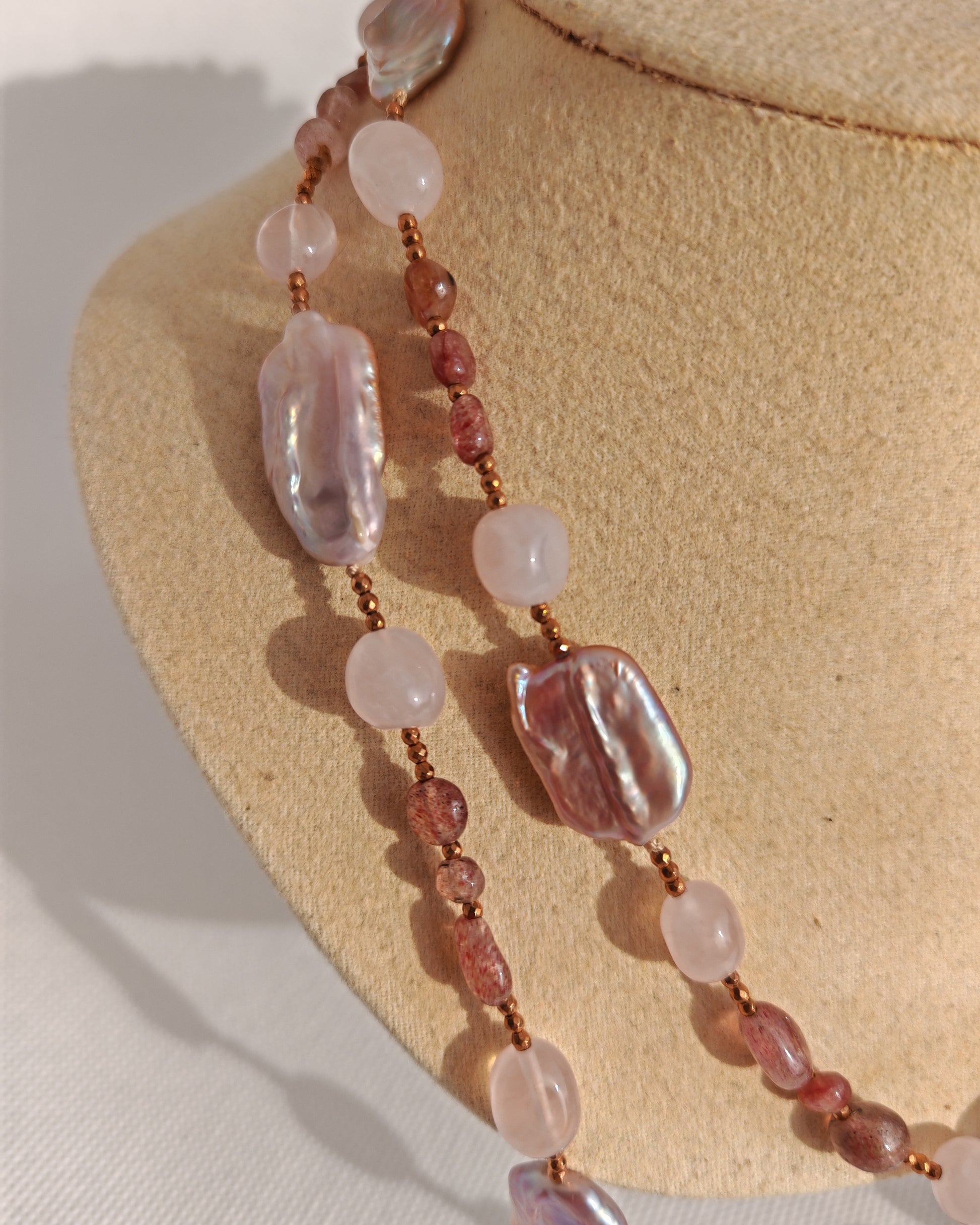 Quarzo e madreperla: L'alternanza di questi materiali crea un contrasto visivo e tattile. Il quarzo, con la sua trasparenza e brillantezza, si abbina perfettamente alla madreperla, che riflette la luce con le sue sfumature iridescenti, aggiungendo un tocco di eleganza naturale.