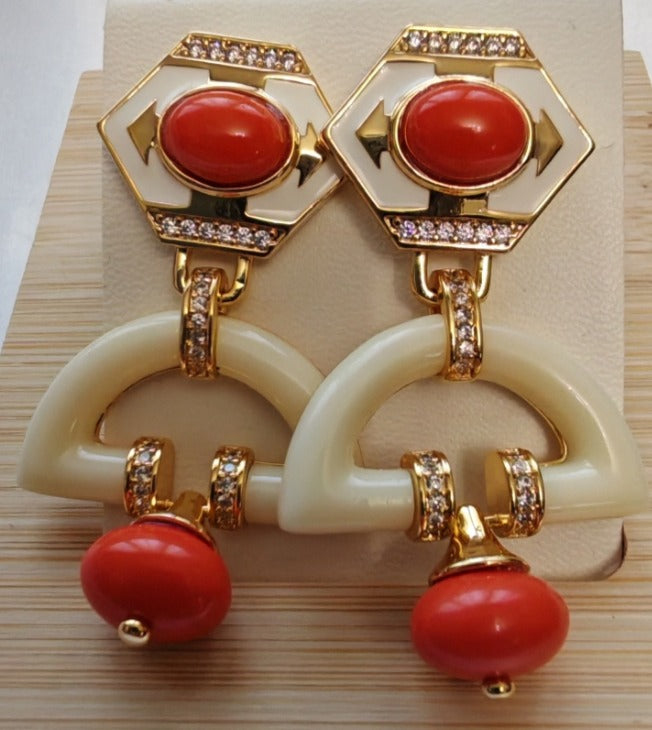 Orecchini Pendenti Geometrici in Ottone e Corallo